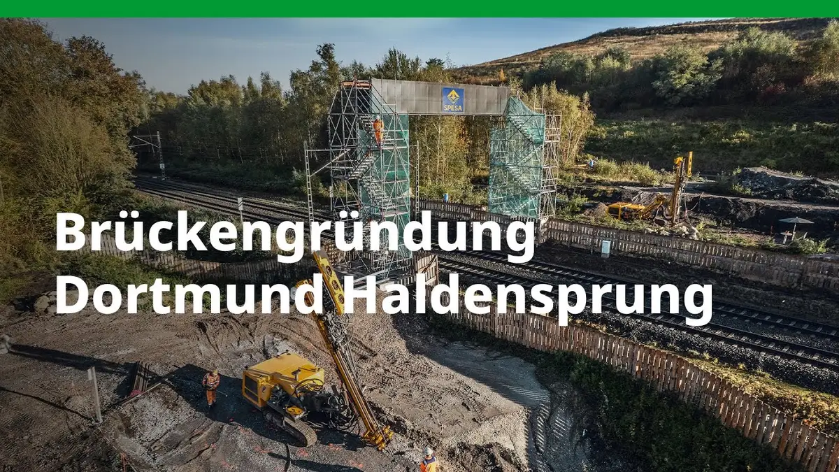 Für den Neubau der Fuß- und Fahrradbrücke "Haldensprung" wurde die SPESA Spezialbau und Sanierung GmbH von der Stadt Dortmund mit Gründungs- und Baugrundverbesserungsmaßnahme beauftragt. „Für die Gründung werden wir insgesamt 140 Mikropfähle an den Einzelfundamenten der neuen Brücke herstellen“, erklärt Sebastian Otto, Projektleiter bei Spesa. „Zusätzlich führen wir 2.100 m Baugrundverbesserung mithilfe des von der Spesa entwickelten Niederdruckerosionsverfahren aus.“ Für die Spezialtiefbauarbeiten kommen jeweils ein KLEMM KR 805 und KLEMM KR 801 Bohrgerät sowie drei Mitarbeiter pro Bohrgerät zum Einsatz. Da die Arbeiten auf freiem Feld erfolgen, war zudem die Errichtung einer vollständigen Strom- und Wasserversorgung notwendig. „Darüber hinaus haben wir eine temporäre Gerüstüberführung für Fußgänger über die angrenzenden Bahngleise hergestellt“, so Sebastian Otto weiter. Die Arbeiten haben im Mai 2024 begonnen und werden voraussichtlich im Februar 2025 abgeschlossen. So wird aktuell der Grundstein für den Dortmunder Zukunftsgarten gelegt, der 2027 sicherlich für großes Staunen sorgen wird.